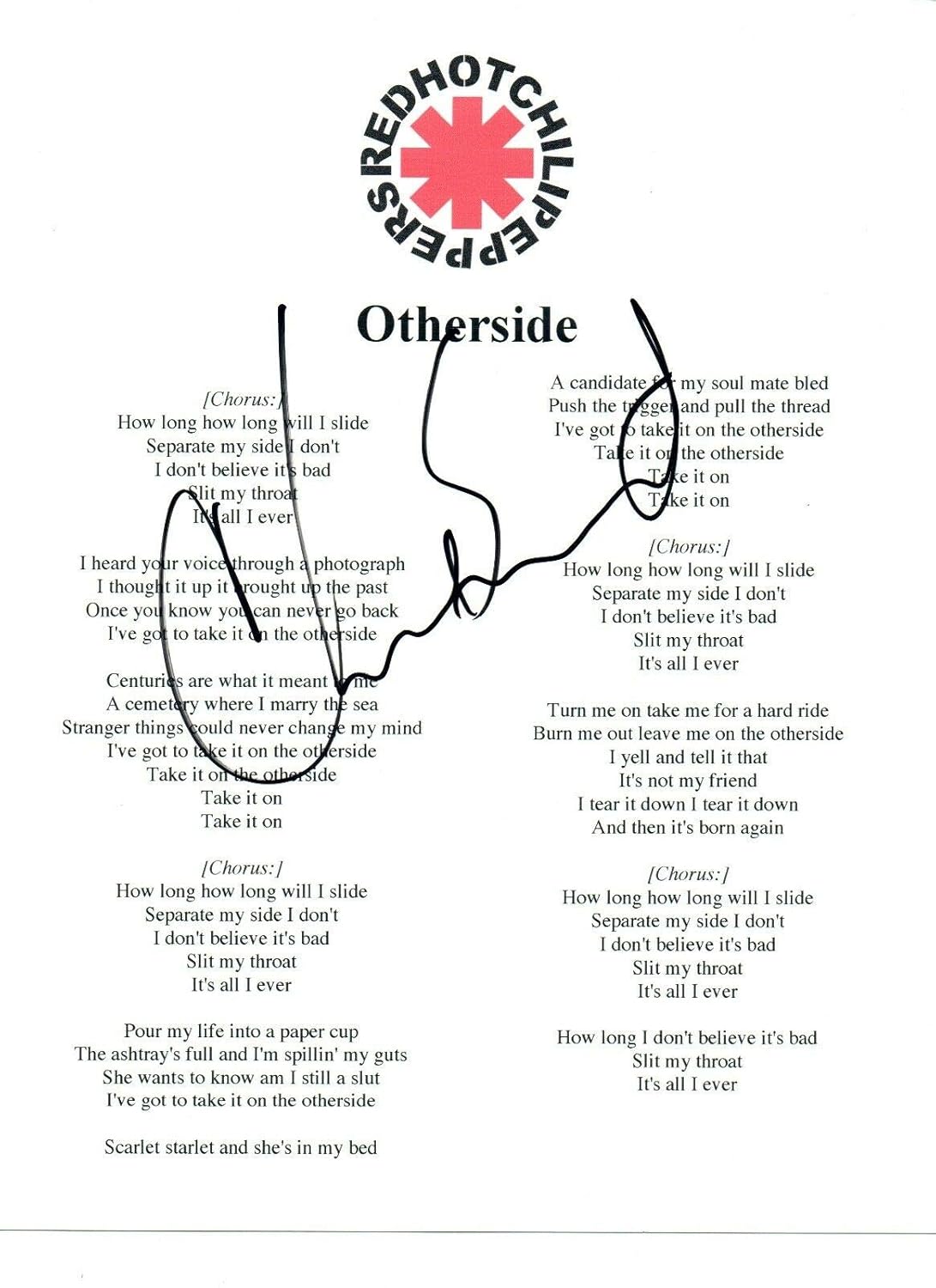 Red hot chili peppers otherside with lyrics definitely subscribe if youre a rhcp fan. Turn me on take me for a hard ride burn me out leave me on the otherside i yell and tell it that its not my friend i tear it down i tear it down and then its born agai how long how long will i slide separate my side i dont i dont believe its bad slit my throat its all i.