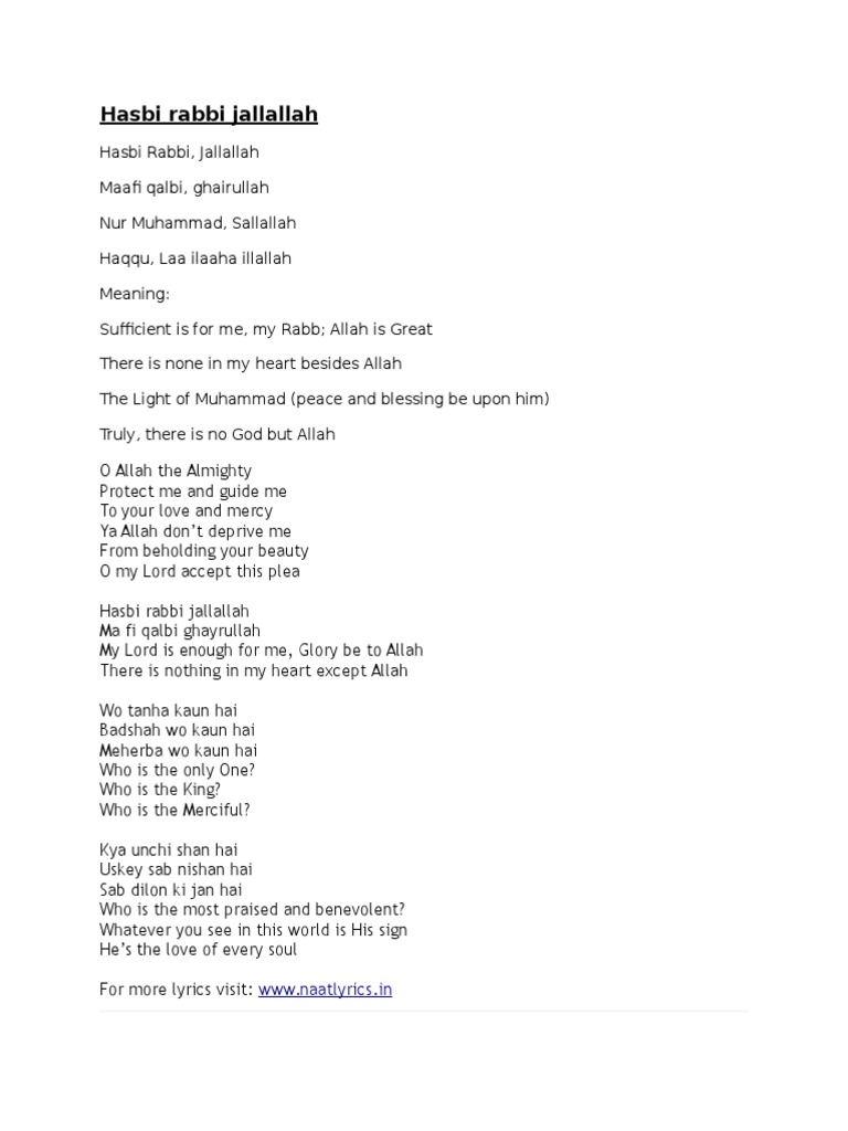 O allah the almighty protect me and guide me to your love and mercy ya allah dont deprive me from beholding your beauty o my lord accept this plea chorus. Hasbi rabbi jallallah by hafiz abu bakr beautiful naat with lyrics mp3 download hasbi rabbi jallallah ma fi qalbi ghairullah noor e muhammad sallalla laailaha illallah tere sadqe me aaqa sare jahan ko deen mila bedeeno ne kalma padha laailaha illallah. Ya nabi salam.