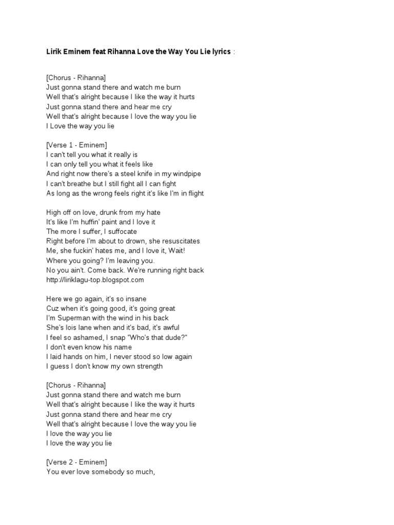 Don't forget to bookmark rihanna love the way you lie lyrics using Ctrl + D (PC) or Command + D (macos). If you are using mobile phone, you could also use menu drawer from browser. Whether it's Windows, Mac, iOs or Android, you will be able to download the images using download button.