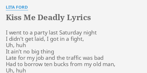 Original lyrics of kiss me deadly song by lita ford. Lita ford kiss me deadly lyrics album. Kiss me twice cmon pretty baby kiss me deadly had a few beers gettin high sittin watchin the time go by uh huh it aint no big thing nothin to eat and no tv lookin in the mirror dont get it for me uh huh it aint no big thing but i know what i like i know i like dancin with you and i know what you like i know you like dancin with.